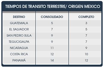 Servicio terrestre semanal consolidado y completo desde México y Guatemala (destino final Centroamérica); unidades adecuadas, transportes en buenas condiciones, operadores comprometidos con nuestra compañía en ofrecerles a nuestros clientes servicios de calidad, con tiempos de transito oportunos.